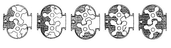 ZW-LXZ系列雙轉子流量計對流體流量的測定是在計量腔體內完成的。一對螺旋轉子在液體的壓力下轉動,轉子與計量腔壁間形成的封閉空間(圖陰影部分)每回轉一次排出8倍陰影體積。因此根據這一關系,只要計量轉子回轉的次數,即可計算出流量累積量,根據每秒的轉數,即可測出瞬時流量。